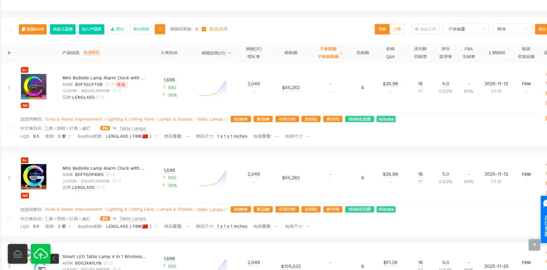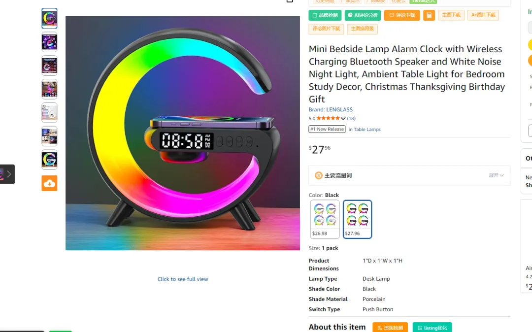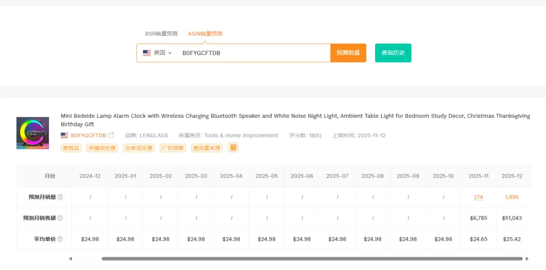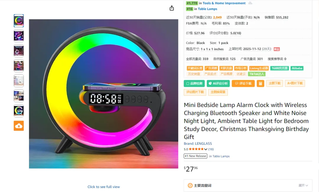 (1)从时间节点看:11-12 月是欧美圣诞、感恩季的消费旺季,产品标题明确标注 “Christmas Thanksgiving Birthday Gift”,精准契合节日礼品需求,旺季流量 + 礼品属性共同推动销量爆发; (2)从产品属性看:多功能(床头灯 + 闹钟 + 无线充电 + 蓝牙音箱 + 白噪音)的组合,在 “Tools & Home Improvement” 类目下具备差异化竞争力,满足卧室 / 书房的多场景需求,容易吸引用户。