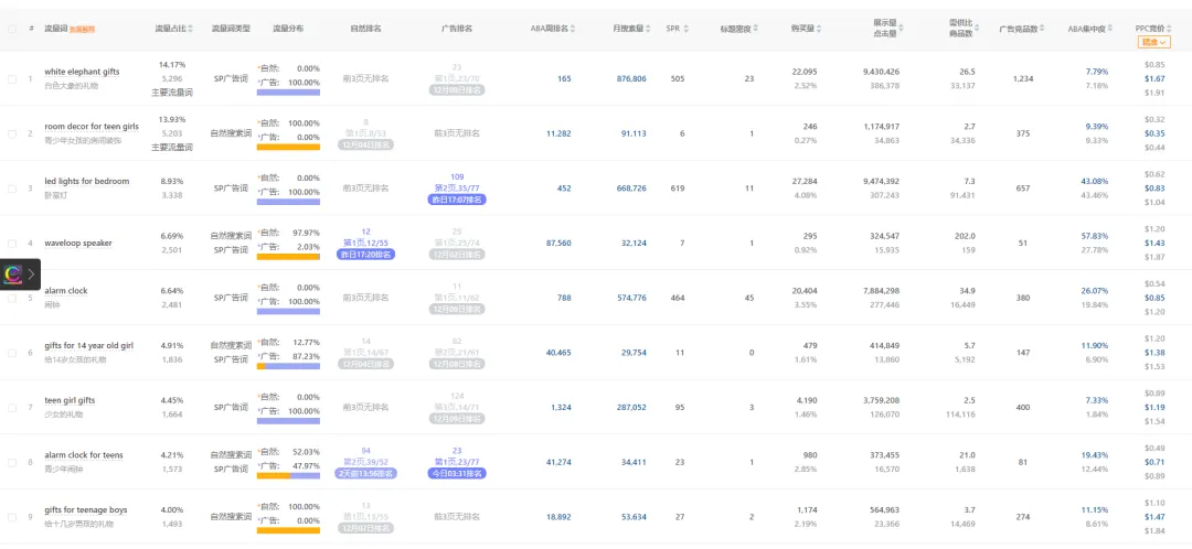 2,自然优势词(如 “room decor for teen girls”“waveloop speaker”):流量稳定、成本低,需维护自然排名; 3,细分人群词(如 “gifts for 14 year old girl”):需求精准、竞争小,适合做垂直人群的差异化产品。