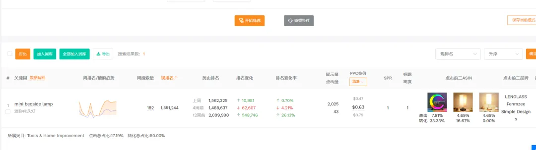(1)高搜索量词:“white elephant gifts” 月搜索量 876,806、“led lights for bedroom” 668,726、“alarm clock” 574,776,这三个词是高需求词,市场热度极高;(2)中低搜索量词:“waveloop speaker” 32,124、“gifts for 14 year old girl” 29,754,需求相对小众,但精准匹配细分人群。 2,排名表现