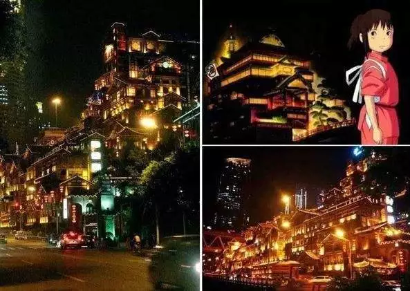 洪崖洞其实是经过改造的,其当初的设计理念便是依靠《千与千寻》IP,在原有的、本就相似的形象上,更加接近《千与千寻》中的“汤屋”形象,将洪崖洞的人气推上新的顶峰。