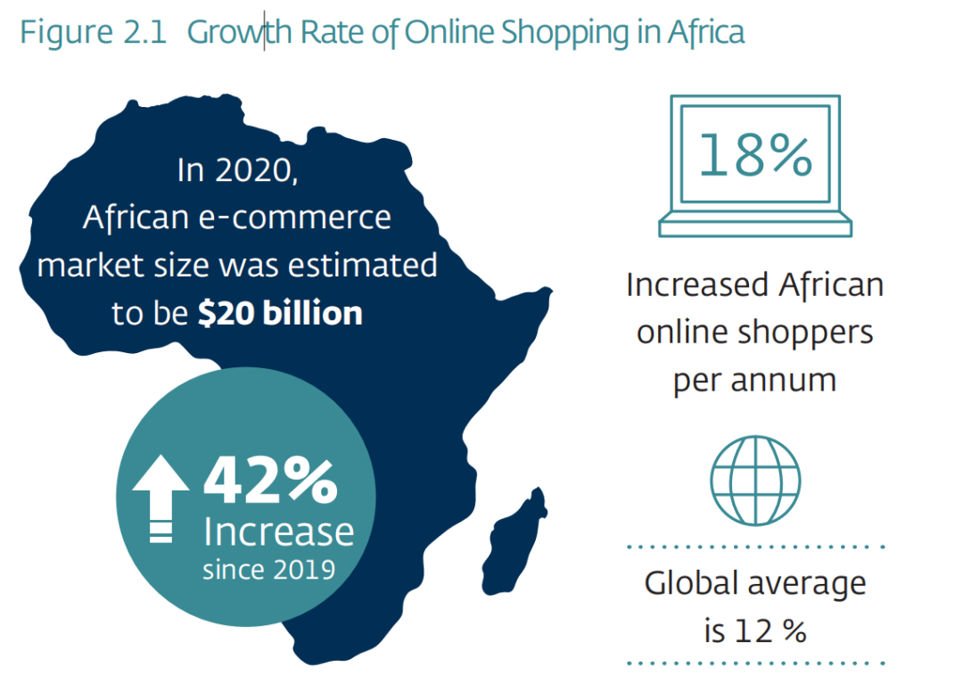 据统计,2014 年至 2020 年期间,非洲的网购人数平均每年增长 18%,而全球平均增长率为 12%。在2020年,非洲电子商务市场规模估计为200亿美元,相比2019年,增长了42%。