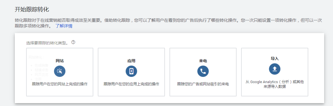 选择追踪转化,有 “网站”、“应用”、“来电”、“导入”这四个选项,前三个是针对不同的渠道。“导入”是代表可以在Google Analysis 设置了目标,从而导入到ads里。但是通常是在google ads里设置,因为这样通常数据会更加的准确。