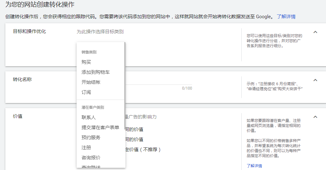 设置一次转化的价值。例如客户成功购买商品后,即完成了转化。
