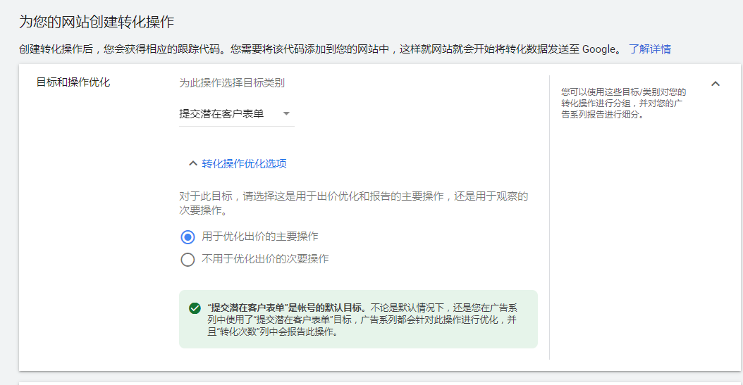 用于优化出价的次要操作:选择后,则系统不会自动优化出价,并且只会在“所有转化次数”列中进行报告。