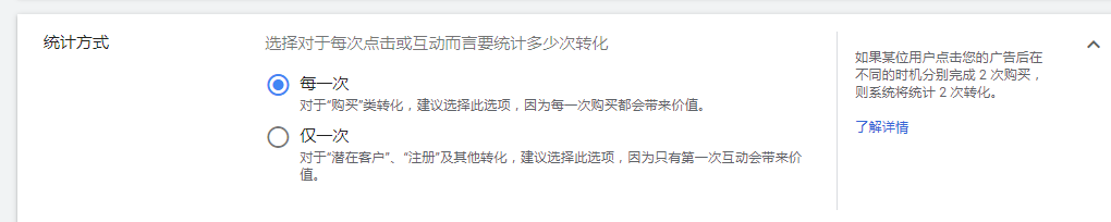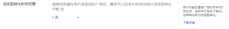 用户可能在看到广告时并未与广告互动,但后来又完成了转化。这种转化称为浏览型转化。按照默认即可