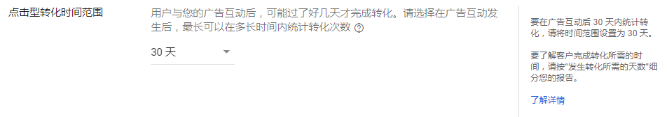 代表抓取转化行为的时间范围。用户在第一次点击广告,没有形成转化。但是在30天内,在以后的访问中形成了转化。这个时间范围可以自主选择,通常按照默认30天即可。