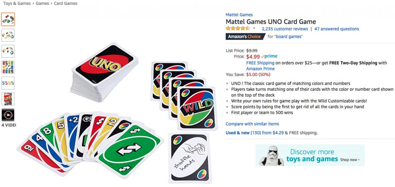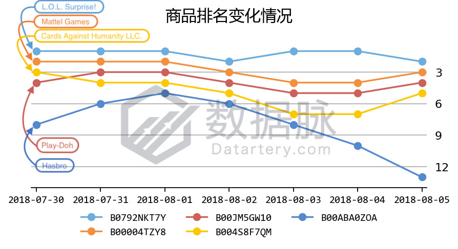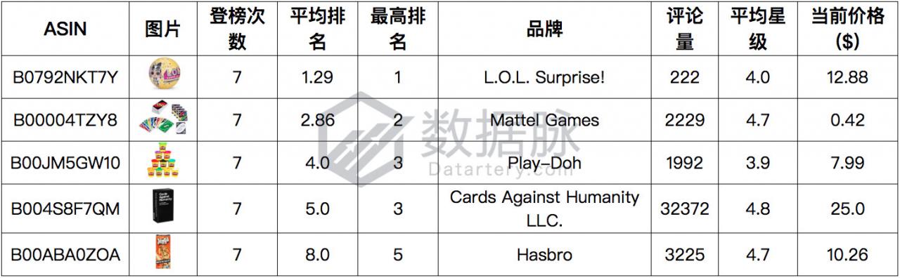 骆探长 (shujumai.com)注意到,品牌Mattel Games的经典纸牌游戏在上周榜单表现较为平稳,连续七天稳居榜单前四,以平均排名2.86的优秀成绩位列商品综合排名第二;