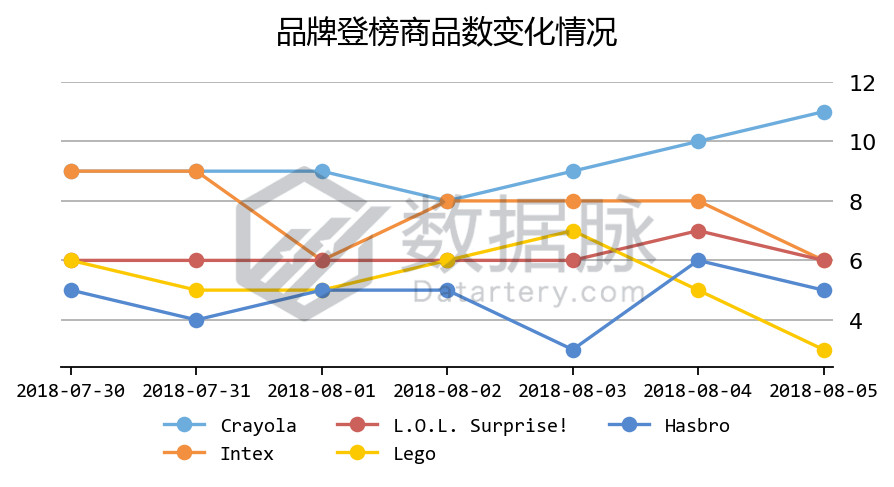 可以看到,在上周 Toys & Games 品类的 Best Seller 榜单中,品牌之间竞争激烈,其中彩色蜡笔品牌Crayola以累积登榜65次、登榜12款商品的小优势夺得品牌综合排名首位;此外,骆探长(shujumai.com)发 现,游泳道具品牌Intex相比上期分析,上周的榜单表现有大幅度下降,不过也凭借累积的登榜54次的优秀成绩位列品牌综合排名第二;五彩玩偶品牌 L.O.L. Surprise!则以登榜43次位列品牌综合排名第三。