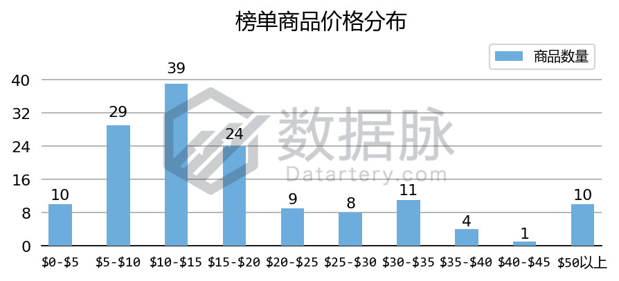 在上周 Toys & Games 品类的 Best Seller 榜单中,商品最高价$99.99, 最低价$0.42,平均价格$17.49。骆探长(shujumai.com)发现,在上榜的商品中,上榜商品主要集中定价于$5.00-$20.00价格段,其中有 26.85%的上榜商品价格分布在$10.00-$15.00区间,同时定价于$5.00-$10.00区间的上榜商品也占据了上榜商品总数的 21.48%,另有14.09%的上榜商品定价在$15.00-$20.00价格段。骆探长(shujumai.com)发现,相较于前几期分析,该周进 榜商品的平均价格有所下降,近期低价商品的竞争力有所上升。此外,上周共有4款上榜商品的定价在$50.00以上,占上榜商品总数的2.68%。