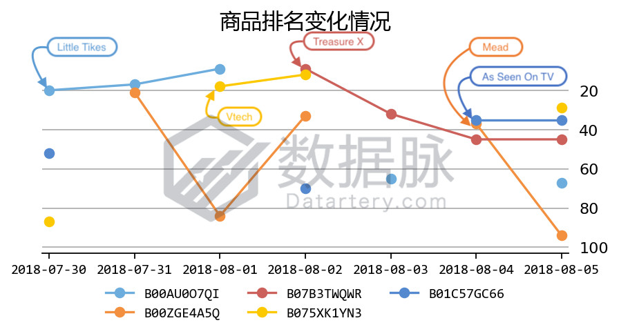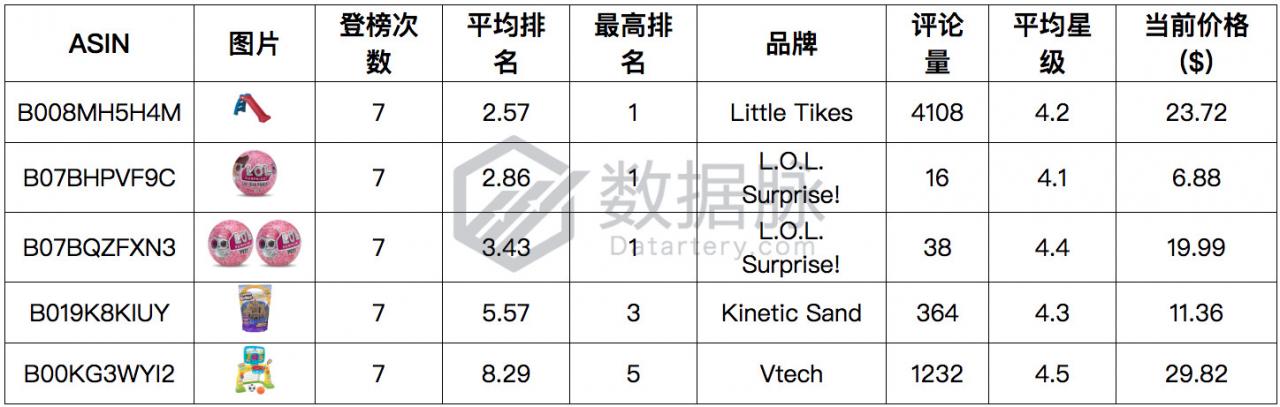 可以看到,在上周 Toys & Games 品类的 Hot New Releases 榜单中,商品之间竞争较为激烈,其中来自品牌Little Tikes的小孩玩具滑梯在上周连续七天位列榜单前四,以平均排名2.57位列商品综合排名首位;