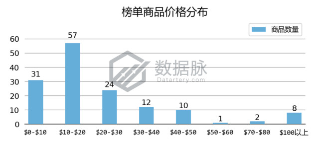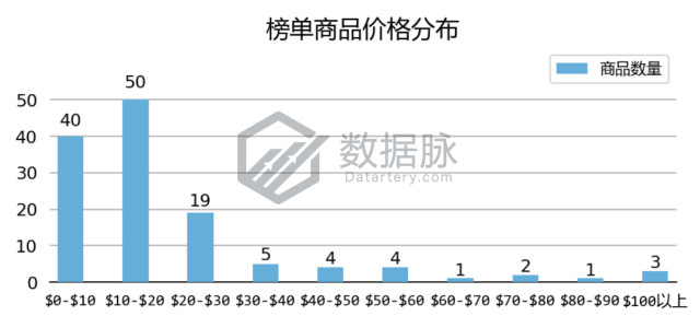上周 Kitchen & Dining 品类 Best Seller 榜单商品最高价$269.95, 最低价$2.68,平均价格$24.83。骆探长(shujumai.com)发现,在上榜的商品中, 上榜商品主要集中定价于$0.00-$20.00价格段,其中有38.76%的上榜商品价格分布在$10.00-$20.00区间,同时定价于$0.00-$10.00区间的上榜商品也占据了上榜商品总数的31.01%。骆探长(shujumai.com)发现,相较于前几期分析,该周进榜商品的平均价格大幅度下降;此外,上周共有3款上榜商品的定价超过了$100.00,占上榜商品总数的2.32%。