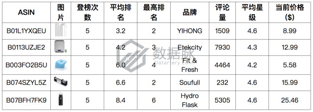 于此同时,品牌Contigo的一款航海蓝水杯登榜3次,以平均排名34.67位列综合排名第五位,其单日最高涨幅高达538.0%,骆探长(shujumai.com)注意到,该商品目前只有252条评论,平均星级为4.3星,该商品的特色值得关注;