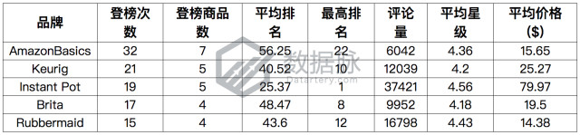 可以看到,在上周Kitchen & Dining品类的Best Seller榜单中, 亚马逊自营品牌AmazonBasics继续在榜单的品牌竞争中保持领跑,以一周总登榜次数32次的成绩位列品牌综合排名的第一。此外,骆探长(shujumai.com)注意到,咖啡机品牌Keurig也在一周中抓住了20次以上的进榜机会,位列品牌综合排名的第二;品牌Instant Pot、品牌Brita、品牌Rubbermaid位列分别以登榜19、17、15次位列品牌排名第三、四、五位。