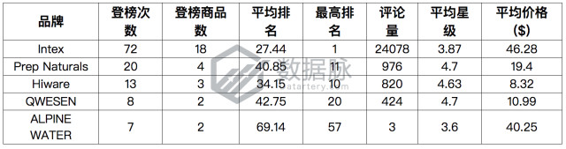 品牌Intex的充气床垫登榜3次,以平均排名33.0位列综合排名第四;