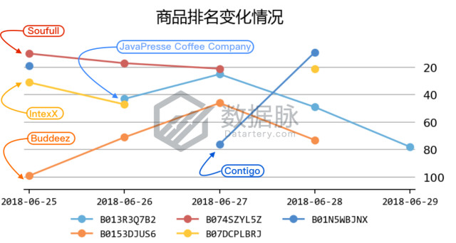 根据上周 Best Seller 榜单上商品的登榜次数及平均排名, 骆探长(shujumai.com)对登榜的商品进行了排序,其中排名靠前的五款商品如下所示: