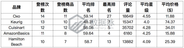 可以看到,在上周Kitchen & Dining品类的Movers & Shakers榜单中, 品牌Oxo共有11款商品登榜,以14次的总登榜次数夺得品牌综合排名首位;咖啡机品牌Keurig共有10款商品登榜,以登榜13次位列品牌综合排名第二位;厨房小家电品牌Cuisinart共有共有12款商品登榜,以登榜12次位列品牌综合排名第三位。