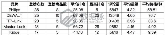 可以看到,在上周的Best Sellers榜单中,品牌竞争十分激烈,照明品牌 Philips 在该周内连续五天有6款商品上榜,以总等榜次数36次的优异成绩领先同榜竞争品牌,夺得品牌综合排名首位;此外,电动工具品牌DEWALT在本周表现同样不俗,以一周内登榜10款商品、共25次总登榜次数,位列综合排名第二位;品牌 TP-Link 的 在本周以登榜商品数5、登榜20次的总等榜次数位列品牌综合排名第三位。