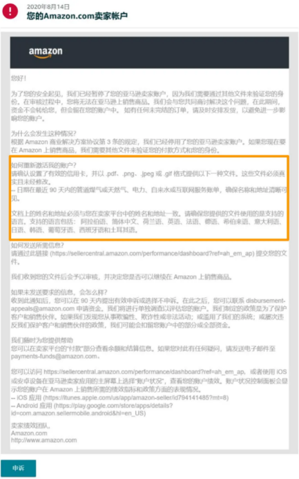 *seller-performance@amazon.com 邮箱(no-replies-appeals@amazon.com或 noreplies-appeals@amazon.xx,“xx”为亚马逊站点缩写,比如co.uk、co.jp 等)发出,但不同的站点间可能有所差异(例如,北美站点的通知可能是通过 alliance@amazon.com 发出))