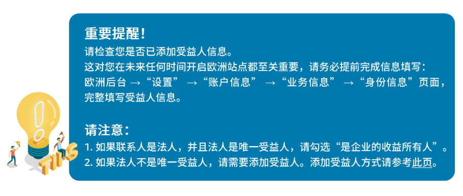 在简化的 KYC 审核流程下,您可能会被要求通过回复邮件确认身份信息,或在后台添加或者确认信息,或者提供非常简单的资料。请注意查看邮件,并及时进入卖家平台的“身份信息”界面提交材料并验证。