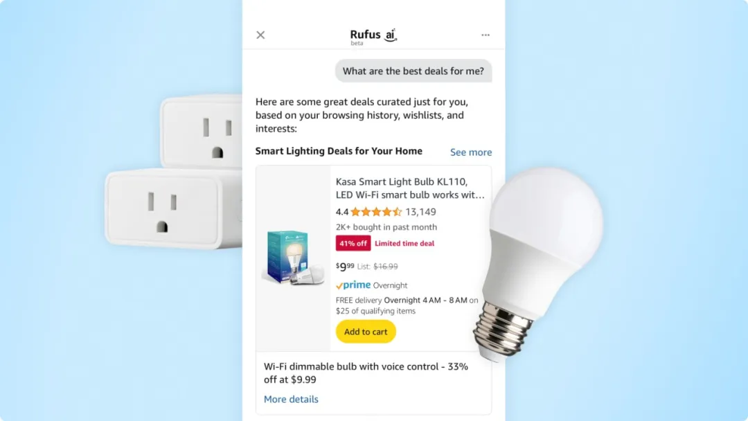 Rufus 会根据买家的心愿单、浏览历史和过往购买记录,自动找出正在打折的相关产品。如果买家提问:我的心愿单里有商品正在打折吗? Rufus 就会推荐出对应的产品。
