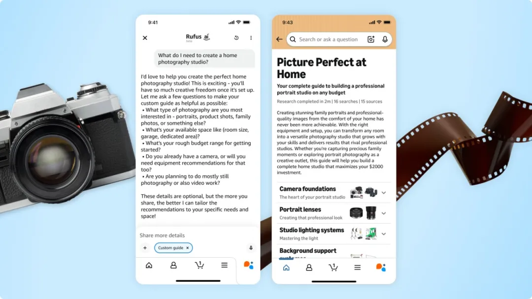 买家询问宽泛话题,如 “搭建家庭摄影工作室需要什么”,Rufus 会整合专业见解并提供包含产品推荐的定制指南。