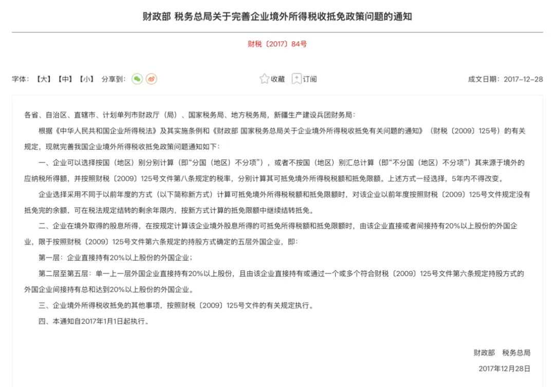 依据财税〔2017〕84号文,FTC制度迎来两项关键调整: