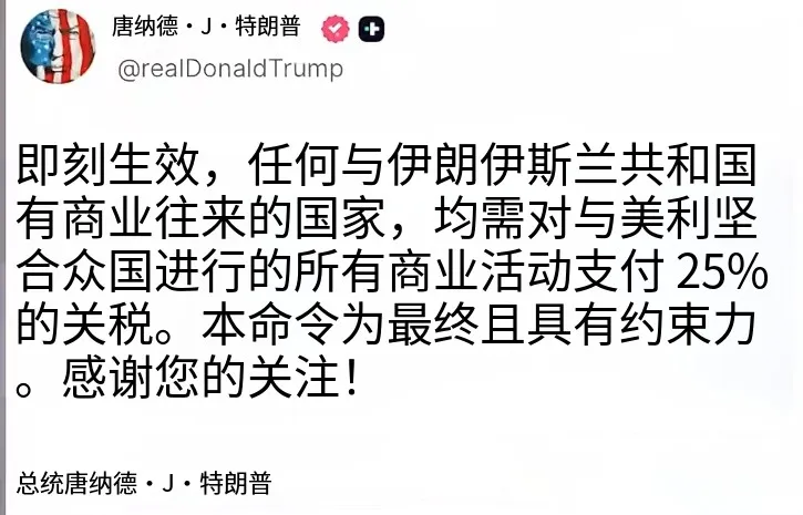据央视新闻报道,当地时间1月12日,美国总统特朗普通过社交媒体“真实社交”发文宣布,即日起,任何与伊朗开展商业往来的国家(包括中国),在与美国进行商业活动时将被征收25%的关税。