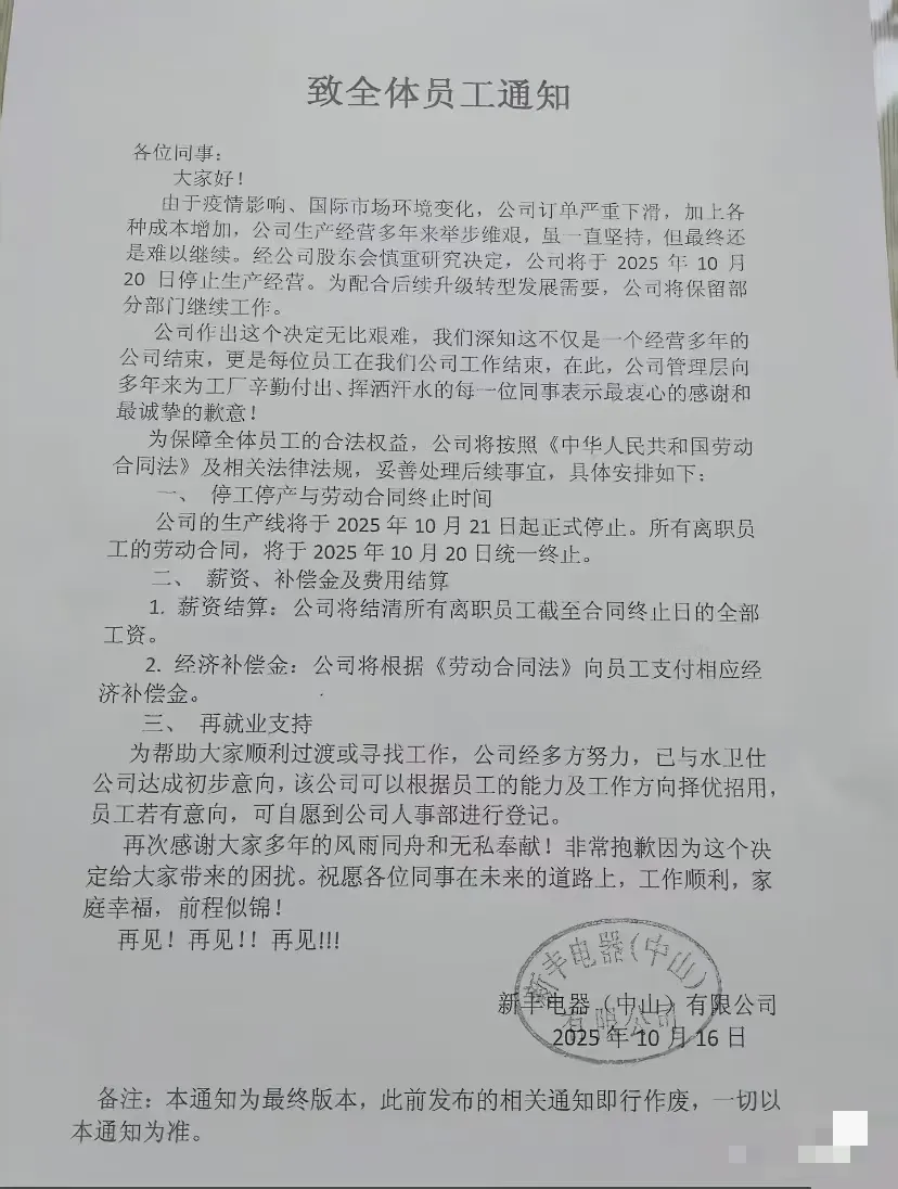 从10月16日发布停产通知,到20日正式停工,仅短短5天时间,其退场显得急促而无奈。但值得肯定的是,与不少企业“草草收场”不同,新丰电器承诺将结清所有员工工资至合同终止日,并依法支付经济补偿。此外,公司已与其他企业达成合作,协助员工转岗安置。