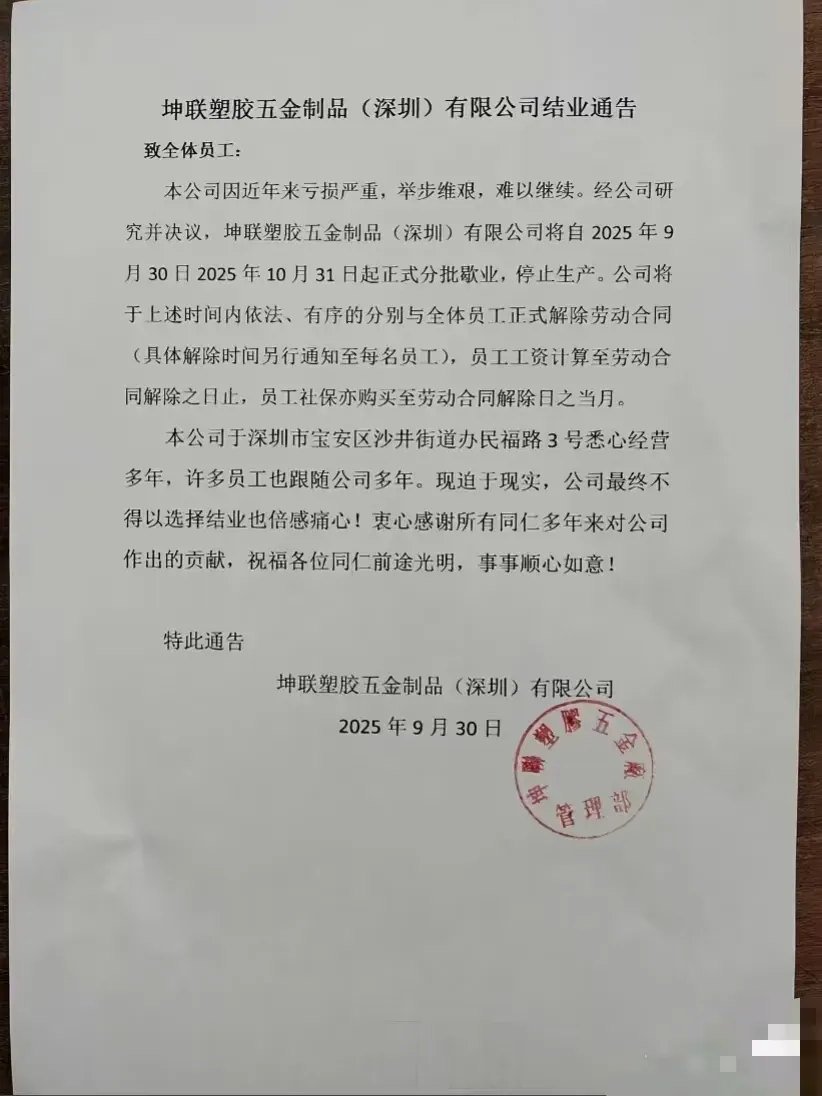 就在新丰电器发布通知前不到20天,位于深圳宝安区的坤联塑五金制品(深圳)有限公司也发布了停产通知,宣布自9月30日起至10月31日分批歇业。该公司成立于1993年,主营塑料及五金拉手、锁具、电子外壳等产品,市场覆盖欧美、日本、加拿大等地。