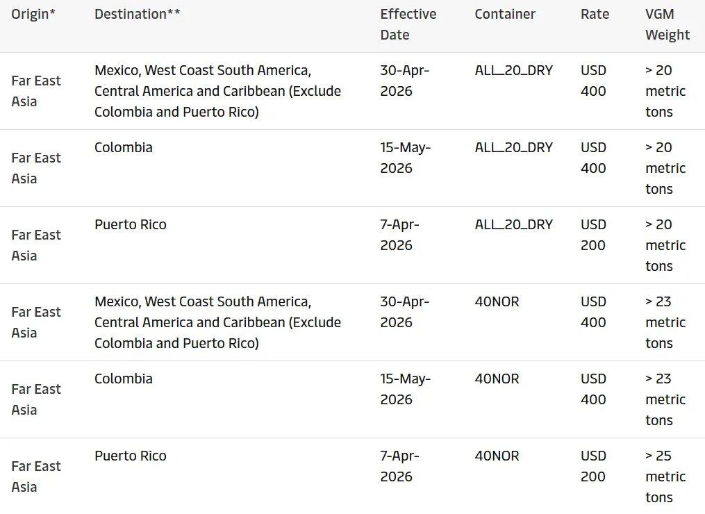 与此同时,马士基则针对部分重货运输调整附加费标准。此次调整主要适用于从远东地区出口至墨西哥、南美西海岸、中美洲及加勒比地区的货物。具体来看,经核实总重量(VGM)超过20吨的20尺干箱,以及超过23吨的40尺冷藏箱,均将适用新的收费标准。相关费用自2026年4月30日起生效,部分国家如哥伦比亚则延后至5月15日执行。