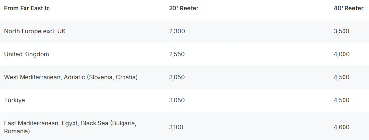 此外,赫伯罗特也同步上调远东至北欧及地中海航线的FAK费率。新价格自2026年5月15日起执行,适用于20尺、40尺及高柜箱型,包括干箱与冷藏箱,显示出欧洲方向运价整体走强趋势。
