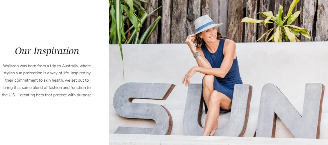 Wallaroo Hats创始人将一次澳大利亚之旅的经历融入品牌理念,借助当地“重视防晒”的文化切入美国市场,持续传递“时尚与防晒结合”的核心理念。这一品牌故事赋予了产品情感价值,成为消费者愿意为之付费的关键,他们买到的不仅是一顶帽子,更是一种生活方式的认同。