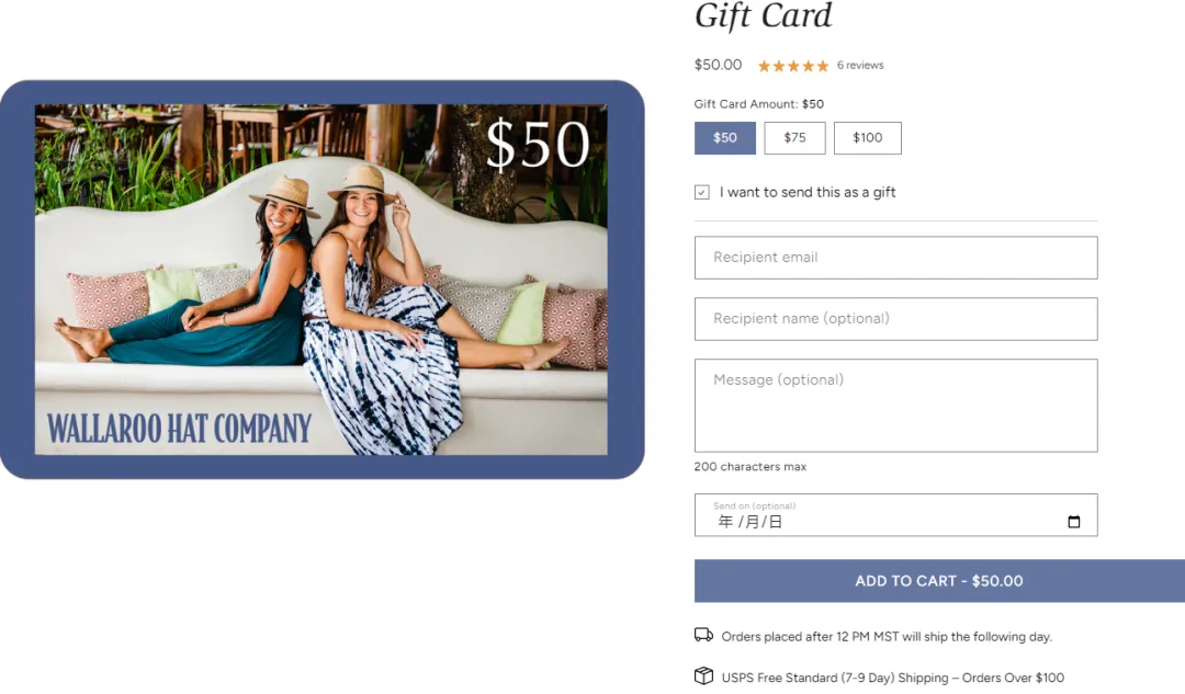 送礼是生活方式类产品一个重要的消费场景。为了满足这一需求,Wallaroo Hats推出了可选金额的电子礼品卡。用户不仅可以为他人购买产品,还可以在不确定对方具体喜好的情况下轻松完成选购。