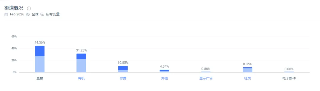 根据similarweb数据显示,Wallaroo Hats官网的流量主要来自于直接访问流量(44.56%)、自然搜索流量(31.28%)、付费广告(10.85%)、社交媒体(8.35%)。