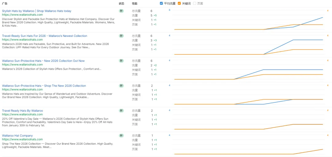 此外,Wallaroo Hats的广告投放策略也体现出其精准的市场定位。广告关键词数量有限,但每条广告的流量质量较高,反映出品牌更注重精准、稳定的投放,而非无差别的铺量。