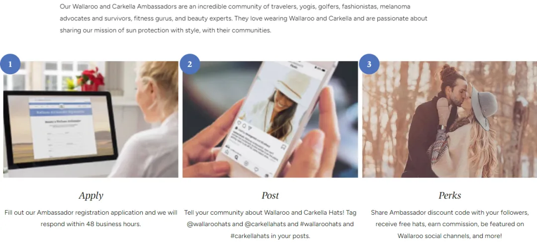 Wallaroo Hats的品牌大使计划并非简单的“带货”合作,而是通过“内容种草+社群扩散+佣金激励”的三位一体增长策略,帮助品牌与目标用户群体建立真实的连接。