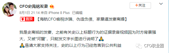8月1日,有微博用户“海航CFO史禹铭的十年发妻”发文,举报海航CFO偷税、伪造负债、家暴逼发妻离婚,同时举报称,身为知名企业财务高官,史禹铭竟然通过PS虚假房产证诈骗银行,数额巨大。