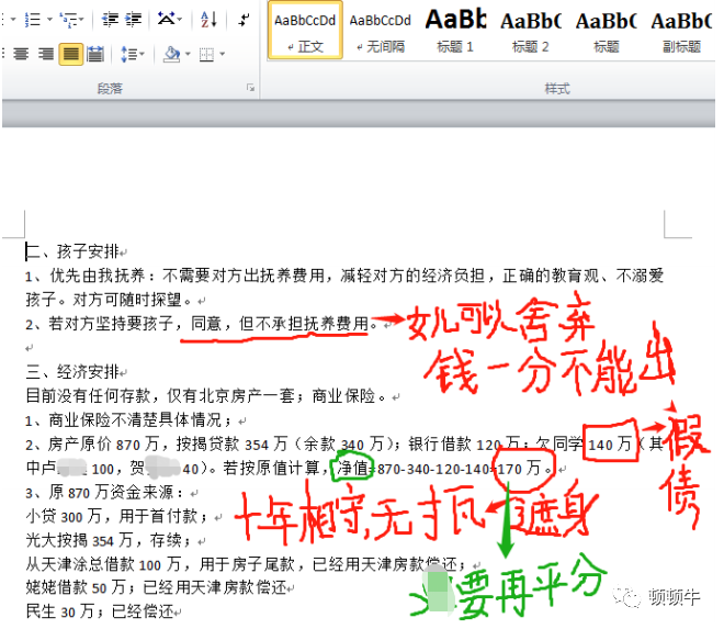 5月,我在家中整理这些年来的照片和点点滴滴,在书房的电脑中看到了去年5月史禹铭第一次提出离婚前准备的一个文件夹,内有两份文档------“家庭安排”和“投资资产INVE”,(此处细节另外开贴贴详情)我颤抖着打开这两个文件夹,一个文档是这个男人一手盘算自己的部分隐藏资产,另一个文档一手盘算着如何编造谎言虚构债务,卖掉共同房产后让我净身出户替其还债,让我们母女无家可归,如果我坚决要女儿抚养权,他不付一分抚养费。