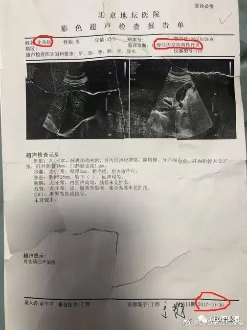 之后我又在家中垃圾桶中,发现了被他撕毁的确诊他患有,慢性丙型病毒性肝炎(丙肝)的检查报告。这张特意销毁的报告单让我回想起了在2017年陪他住院治疗在手术前进行常规检查;