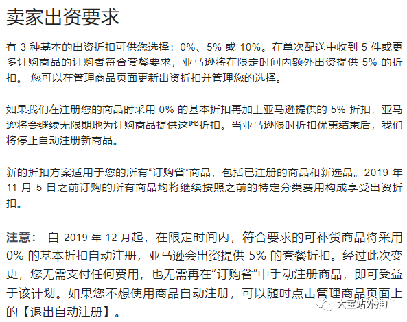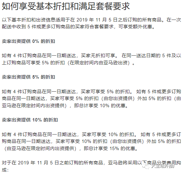 | 商品分类 | 适用于在一次自动配送中收到 1-4 件发往同一地址的订购商品1的买家**的卖家出资折扣 | 适用于在一次自动配送中收到 5 件或更多发往同一地址的订购商品1的买家**的卖家出资折扣 |