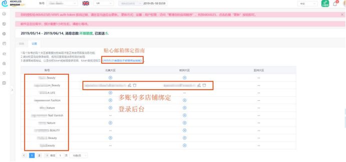 其次,4KMILES有店铺和账号管理中心,它列出了你登录需要的信息,你需要按照指引(如图2邮箱绑定指南)绑定自己的账号,系统很贴心的按照区域的不同对账号管理进行了分类。你可以选择账号在买家消息界面同时回复邮件。