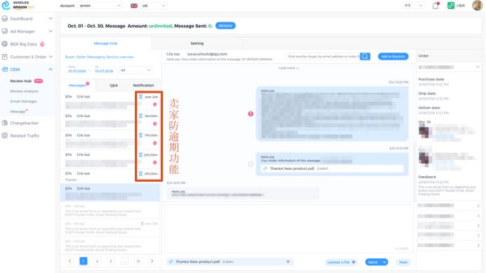 亚马逊规定卖家必须在24小时之内对买家消息进行回复。如果超过24小时(逾期)没有回复,会影响联系回复时间(Contact Response Time)指标,降低店铺的排名,更会影响店铺绩效,从而影响销量。卖家由于时间忙碌,账号太多,不一定能够随时监控邮件的时限情况,那么如何避免逾期?