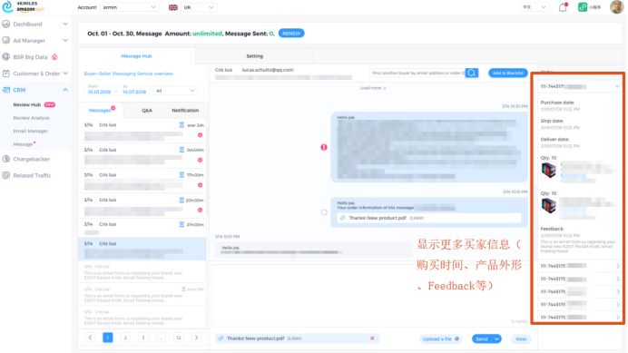 亚马逊邮件系统只提供买家基础的信息(图4),无法了解买家更多的想法,导致无法高效的回复买家消息,4KMILES提供更多买家交易信息(图5),包括:产品外形、Feedback等,有助于多维度的了解买家的心里需求,想要解决的问题,提高回复质量。