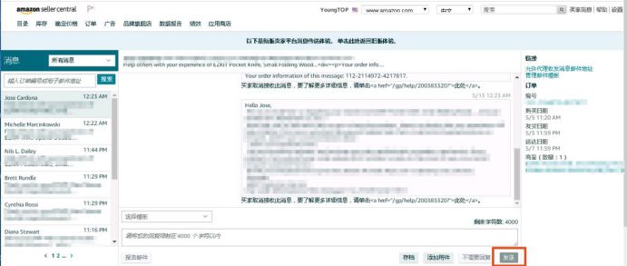 亚马逊邮件系统里,需要用鼠标点击左边邮件(图7),再一一回复,如果消息回复多,需要每一条消息点击一次,增加了时间成本。