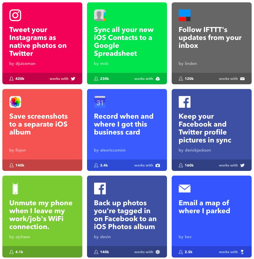 自动化小工具最棒的地方就是可以大量节省你的时间做同样且重复的事情,像是把同一个贴文分别张贴在不同的平台上。如「当我发布Wordpress的文章的时候,帮我同步到Facebook粉丝专页」、「把我在Evernote写的文章同步发到Wordpress」、「帮我把Reddit 每天最热门的文章,转发到我的信箱」。