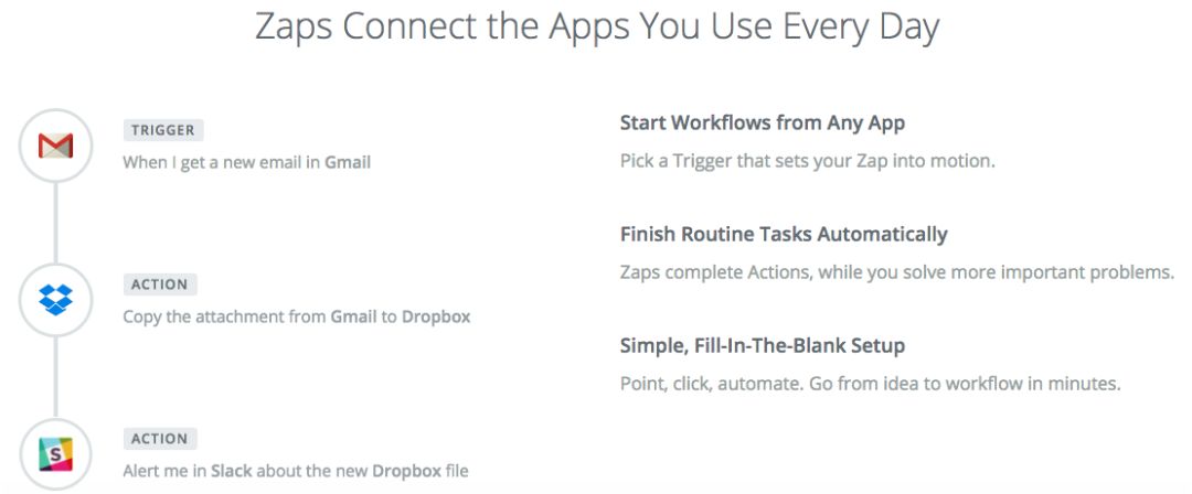 Zapier比起IFTTT则可更进一步地进行多重诱发指令,相较于IFTTT的生活化,Zappier则更偏向工作内容的流线优化。但相同的是,这两个自动化小工具都可以让你省去手动输入资料内容的时间,并且避免人为的出错,也不用再请工程师研发软件去整合不同的软件与工具。