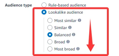 Lookalike就是拓展了人群范围,会出现没有看过你的产品但是系统觉得可能跟那波人有相同的兴趣。Lookalike里面的五类从上到下就是精准度从高到低,人数范围从低到高。比如Most similar可能有300K – 1M 人,Most broad有900K – 10M人。