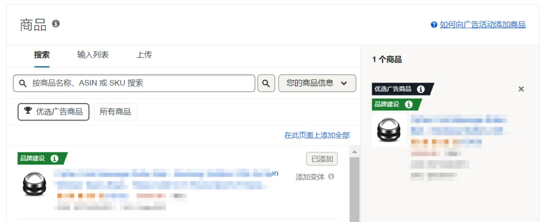 6.5. 选择具体的产品。比如你这个人群包就想针对店铺里那款一个红色的毛衣,那这里就填上红色毛衣的ASIN。