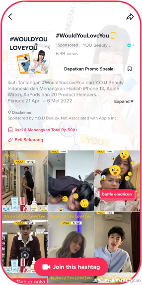 最初 Y.O.U 主要靠线下渠道铺货的方式来销售产品,但是根据化妆品财经在线 CBO 的一篇报道,在疫情后 Y.O.U 逐渐开始了转型,并搭建了一个“All In TikTok”的全链式闭环营销模式,前一段时间还在 TikTok 上发起了一场叫做 #would you love you 的挑战赛,很好地利用起了 TikTok 这一渠道,也是 Y.O.U 能在东南亚市场进一步扩大规模并获得资本青睐的关键。