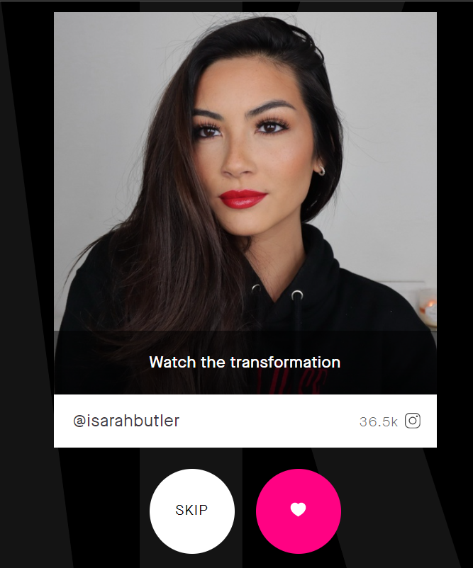 这种独特的购物体验以 Oddity 旗下主打品牌 IL Makiage 为例,当用户刚打开网站页面的时候,首先看到的是一个类似于约会交友 App 的界面,网站会向用户展示来自社交媒体上的美妆类 KOL 的妆容,同时用户可以点击观看该 KOL 的美妆教学视频,在教学视频中,KOL 也会向用户展示这次化妆的过程中使用的是 IL Makiage 的哪一款美妆产品。如果用户喜欢可以像在使用约会交友 App 时那样点击下方的爱心将这位 KOL 以及她的妆容收藏,如果不喜欢就点击“skip”,这位 KOL 就会“左滑”。
